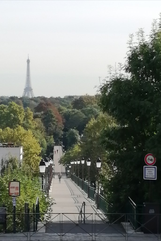 L’une de ses promenades favorites est sur la passerelle au-dessus de la Seine. De là on voit les tours de la Défense sous les nuages sombres et le ciel qui s’élargit loin là-bas en estuaire du côté de la mer. Sous ses pieds, on voit passer les lourdes péniches qui ont une démarche de femme enceinte.