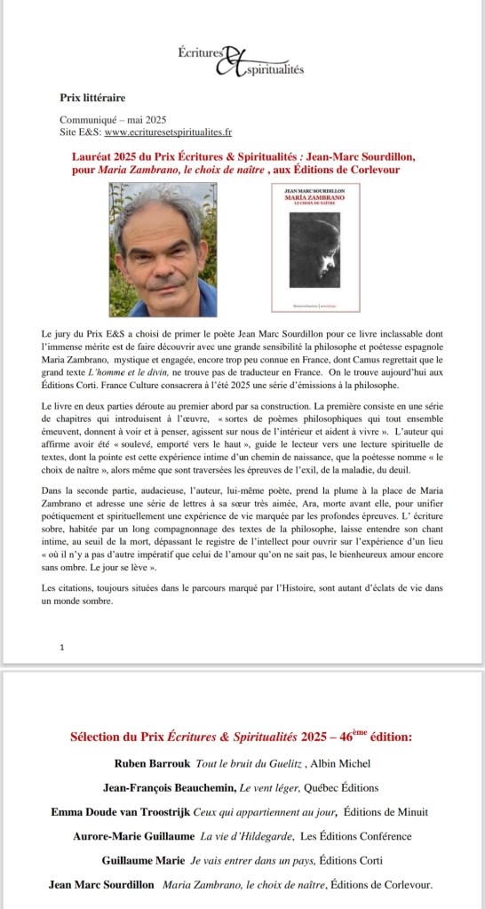 Le jury vous remercie d’avoir écrit ce beau livre et espère – c’est en effet le bon mot – qu’il fera mieux découvrir l’œuvre de Maria Zambrano pour qu’elle accompagne d’autres vies que la vôtre.
