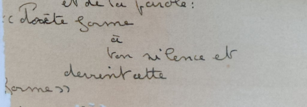 Je me permets, sans autre raison que la façon dont ce poème résonne en moi, dans mon expérience, de changer une lettre de cette formulation, de remplacer le « t » final de « devient » par un « s », pour lire en elle non pas un constat mais une exhortation, une exhortation à aller dans sa vie selon le mouvement de ce silence qui nous précède et nous éclaire, à nous transformer à mesure, à créer la forme où il se révèle parce que c’est ce qu’il exige de nous : naître discontinuellement au long du temps, nous faire naître par la parole, seuls ou mutuellement, dans la façon que nous aurons de parler, de nous risquer ou non dans ce que nous écrivons.