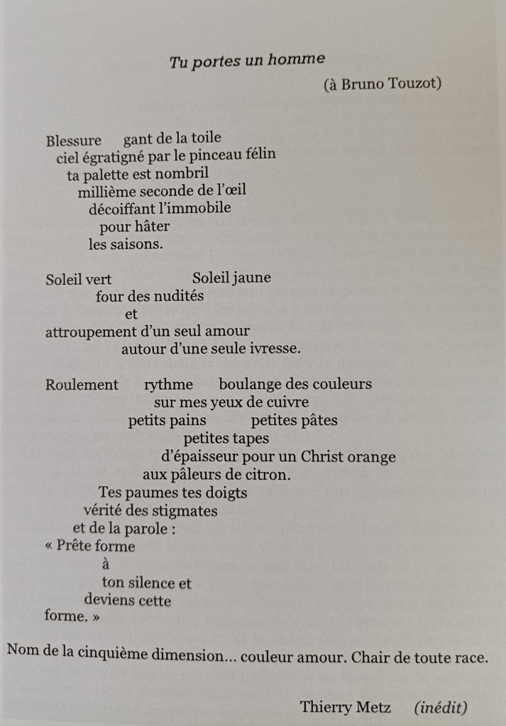 En 1980, Bruno Touzot, un ami très proche de Thierry Metz, expose à Paris une toile intitulée « Un certain regard » au salon des surindépendants. Bruno Touzot est notamment l’auteur de belles couvertures de la revue Résurrection où Thierry Metz publie ses premiers textes. C’est à cette occasion que l’écrivain offre à son ami peintre ce poème « Tu portes un homme ». Dans une lettre qu’il lui adresse à peu près au même moment, il lui apprend qu’il vient de lire la biographie de Van Gogh, une grande tache de sang, calvaire oblitéré par son amour, et il évoque la figure de leur « Maître » à tous deux (c’est ainsi qu’il le désigne), Jean Cussat-Blanc, directeur de la revue Résurrection. D’une manière surprenante et très belle, Thierry Metz présente celui-ci non pas comme un maître, précisément, dominant ses élèves du haut de sa sagesse ou de son savoir, mais comme un petit enfant qui vit en nous …